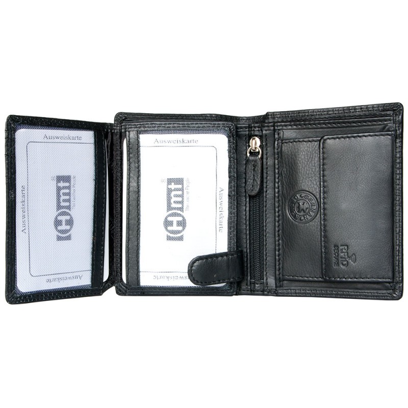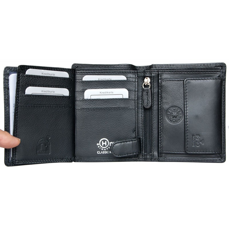 Černá kožená peněženka HMT s látkovou podšívkou s RFID (chráněná data). Rozměr 9,5 x 12,3 cm.