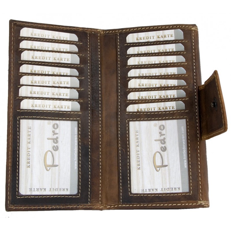 Klasická prostorná celokožená peněženka Pedro z bytelné přírodní kůže. Rozměr 17 x 10-10,5 x 4,5 cm (dva způsoby zapnutí).