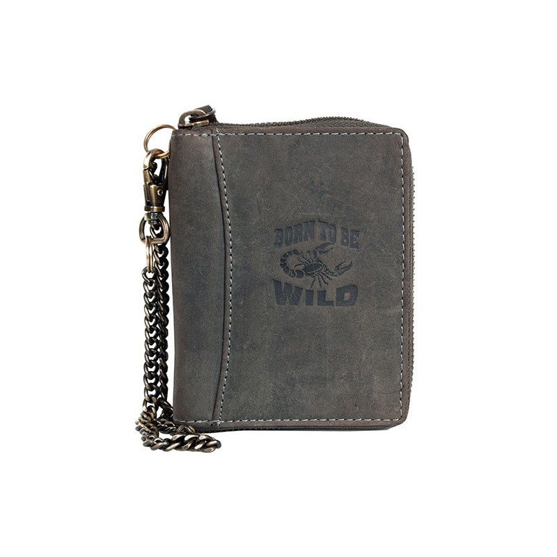 Šedá kožená peněženka Born to be wild se škorpionem dokola na zip s řetízkem a karabinkou. Rozměr 10 x 12,5 cm.