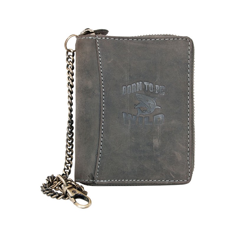 Šedá kožená peněženka Born to be wild se žralokem dokola na zip s řetězem a karabinkou. Rozměr 10 x 12,5 cm.
