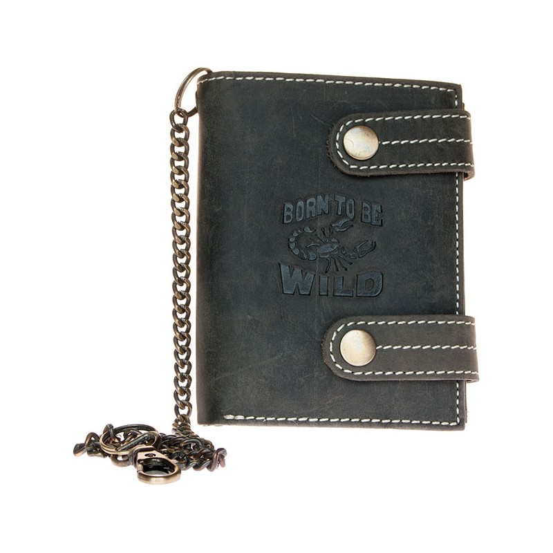 Kožená tmavě šedá peněženka Born to be wild se škorpionem, se dvěma upínkami a 35 cm dlouhým kovovým řetězem a karabinkou. Rozměr 10 x 12,5 cm.