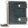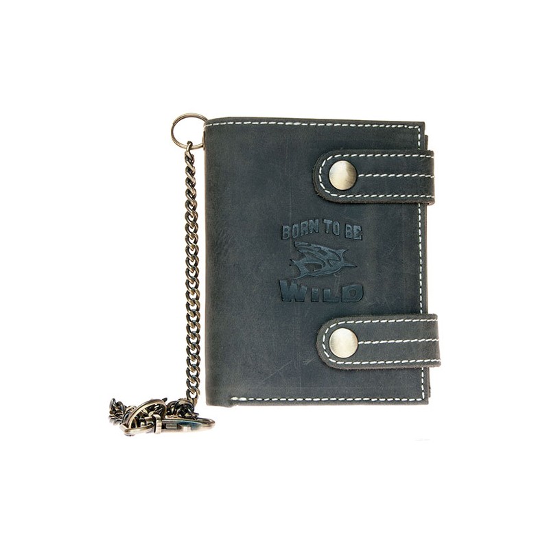 Kožená tmavě šedá peněženka Born to be wild se žralokem, se dvěma upínkami a 35 cm dlouhým kovovým řetízkem a karabinkou