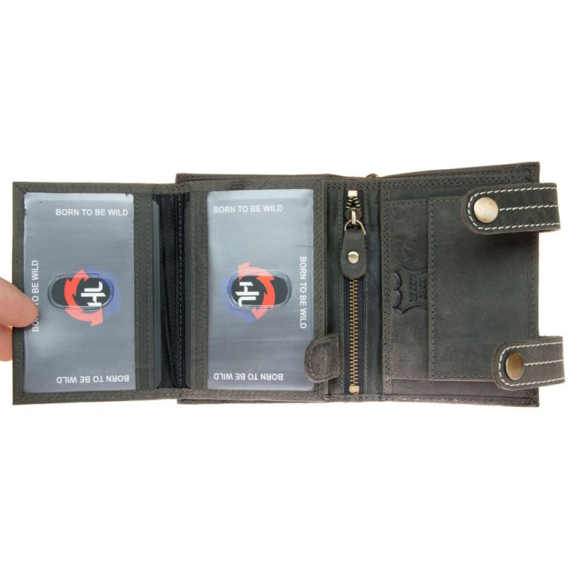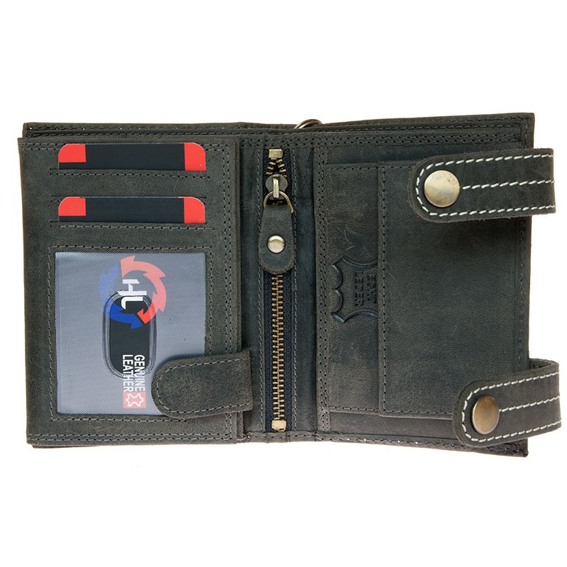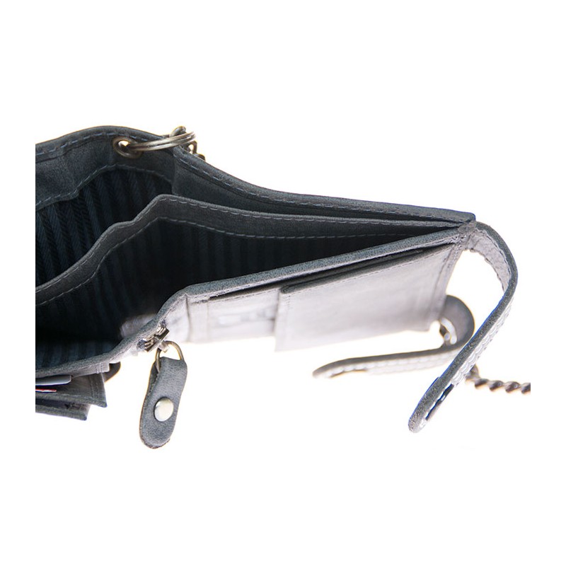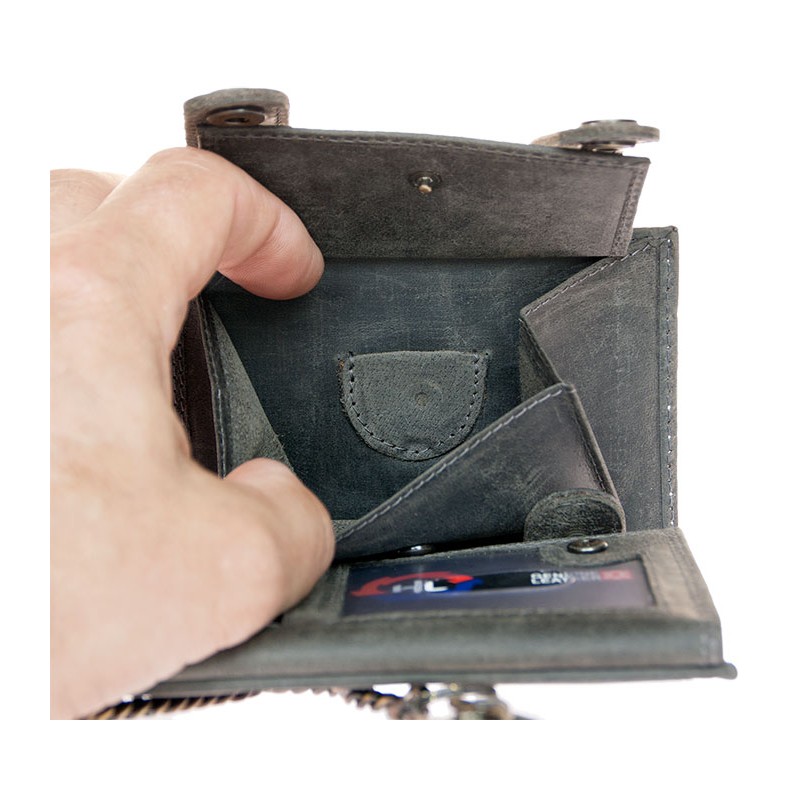Kožená tmavě šedá peněženka Born to be wild se žralokem, se dvěma upínkami a 35 cm dlouhým kovovým řetízkem a karabinkou. Rozměr 10 x 12,5 cm.
