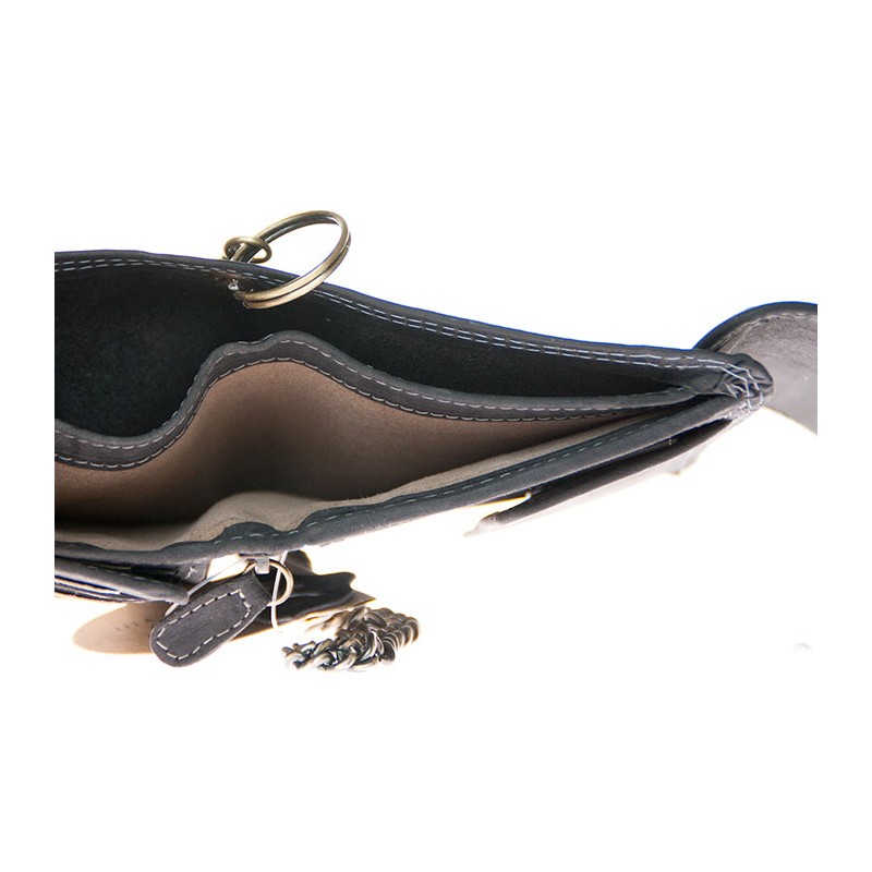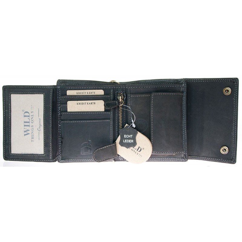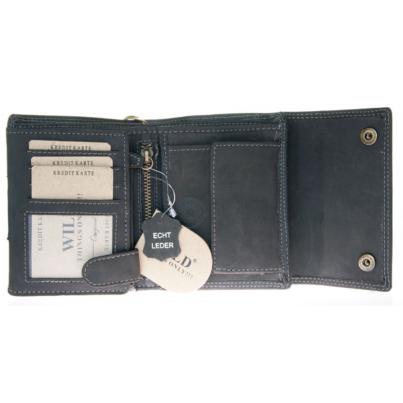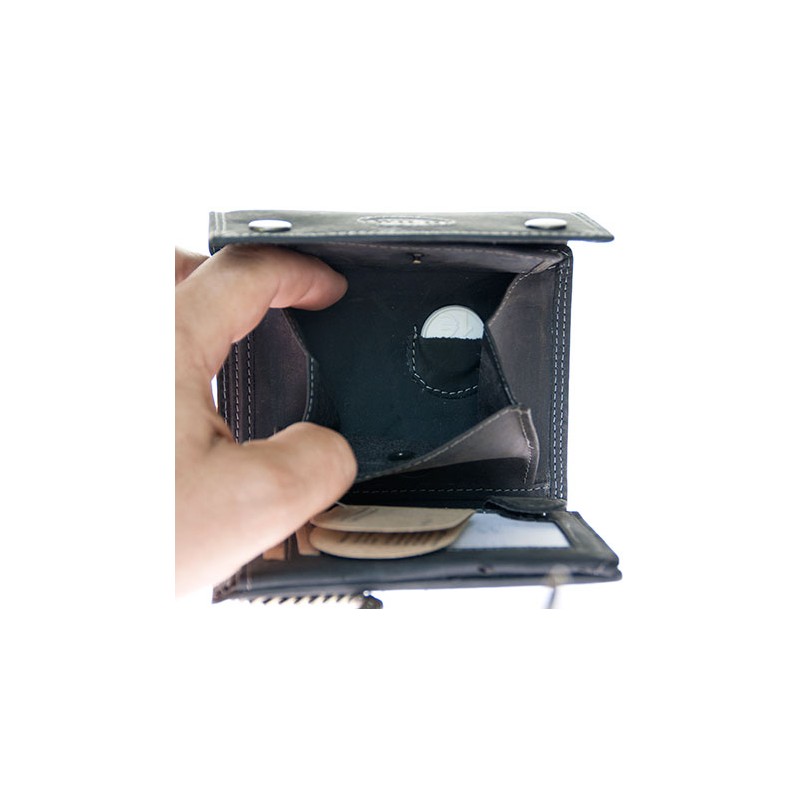 Celá kožená velmi tmavě šedá peněženka Wild z pevné přírodní kůže s 45 cm dlouhým řetězem a karabinkou. Rozměr 12,5 x 10,5 cm.