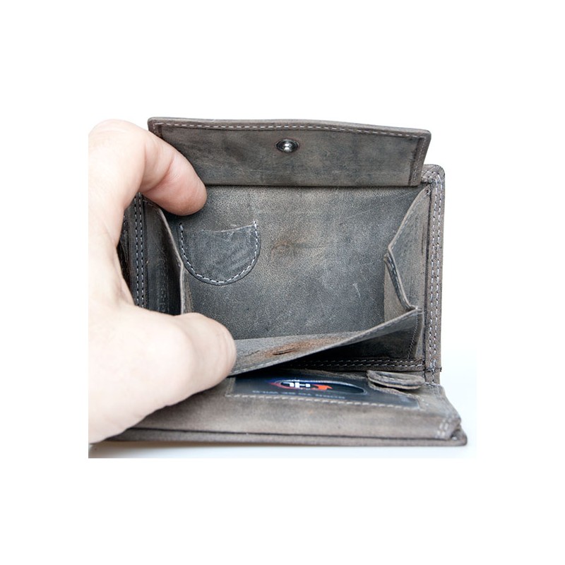 Pánská šedá kožená peněženka s traktorem RFID. Rozměr 9,6 x 12,8 cm.