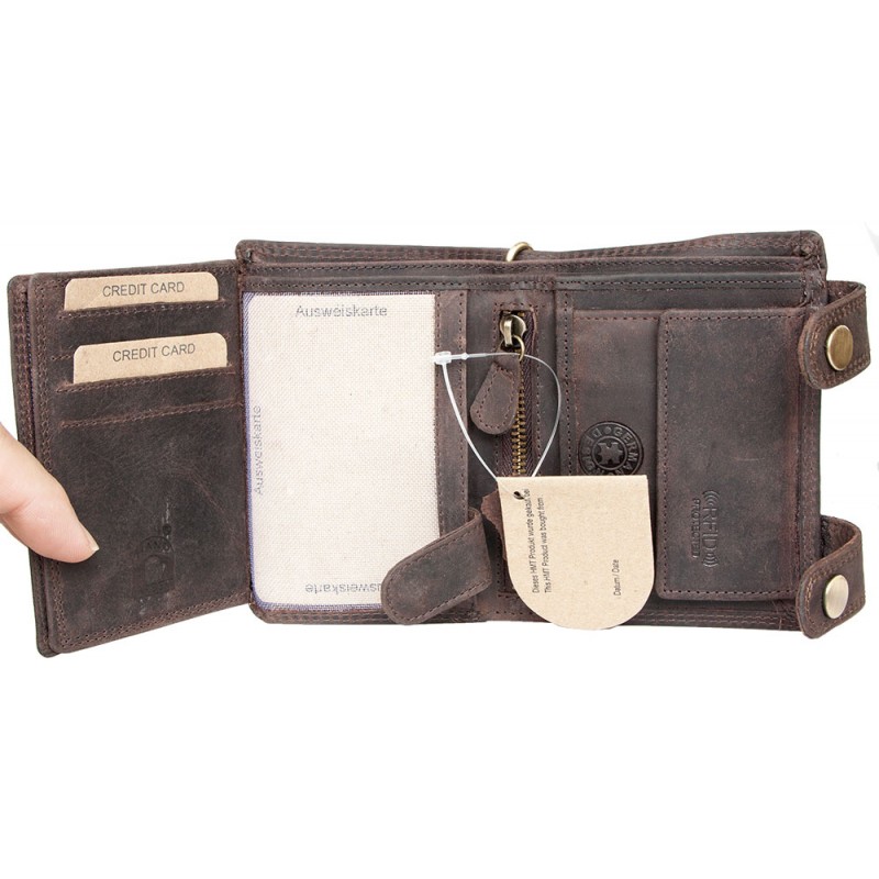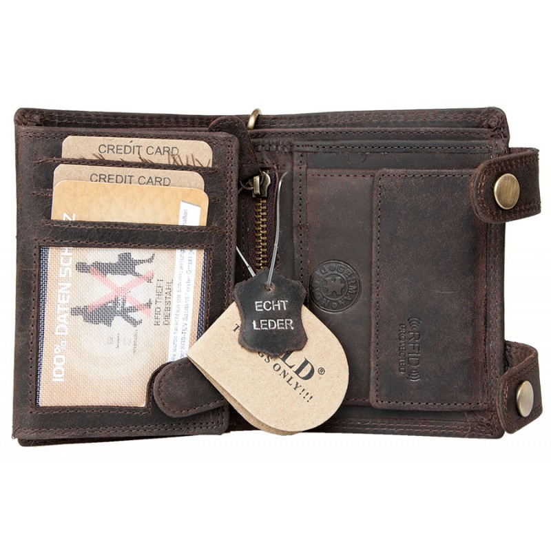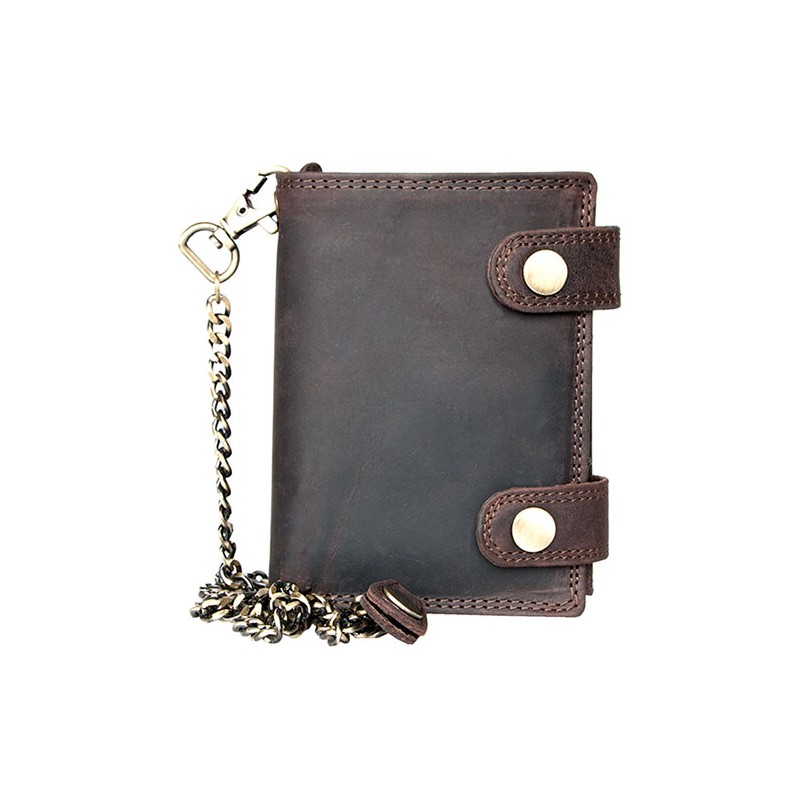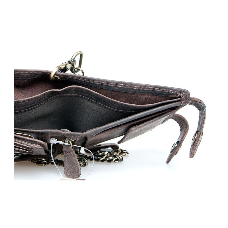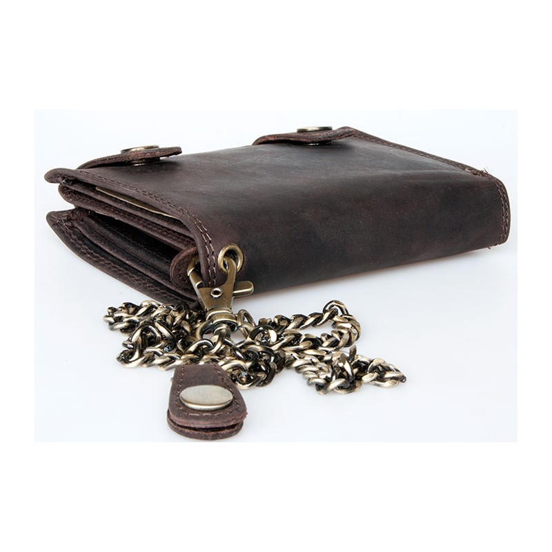 Hnědá kožená peněženka s dvěma sponami a 50 cm dlouhým řetězem bez značek a nápisů s ochranou dat na kartách (RFID).