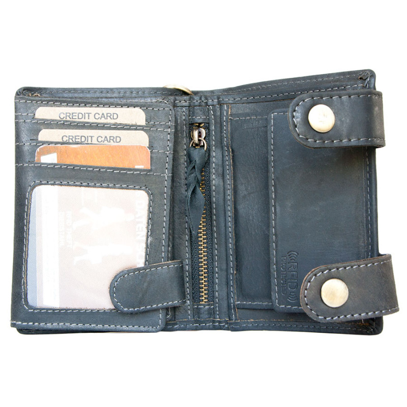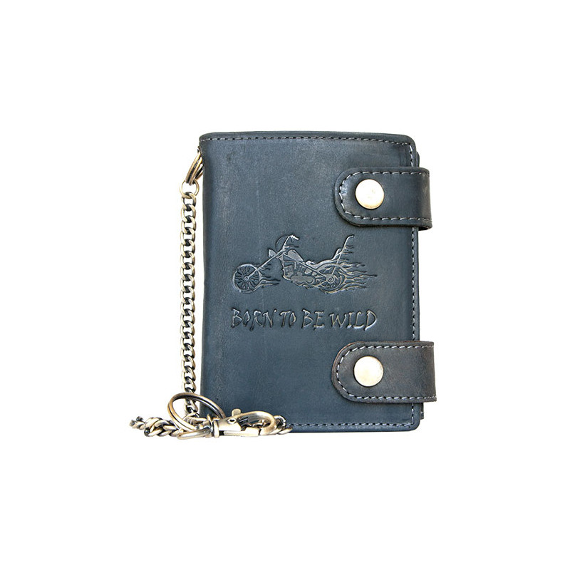 Kožená tmavě šedá peněženka Born to be wild s motorkou, se dvěma upínkami a 30 cm dlouhým kovovým řetězem - RFID (chráněná data na kartách). Rozměr 10 x 12,5 cm.